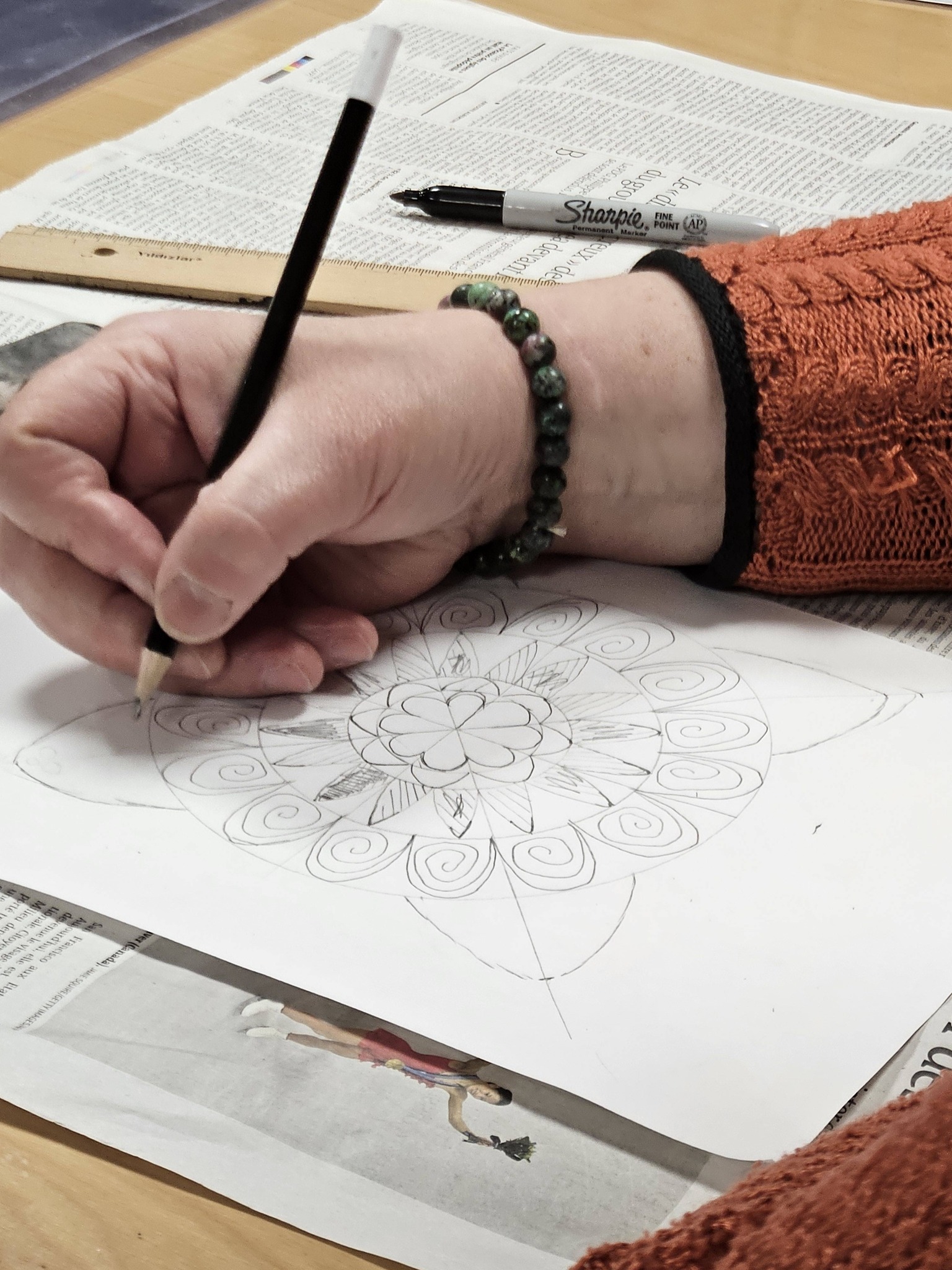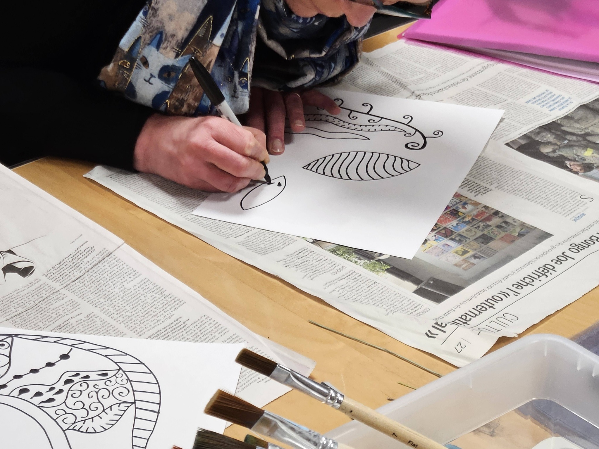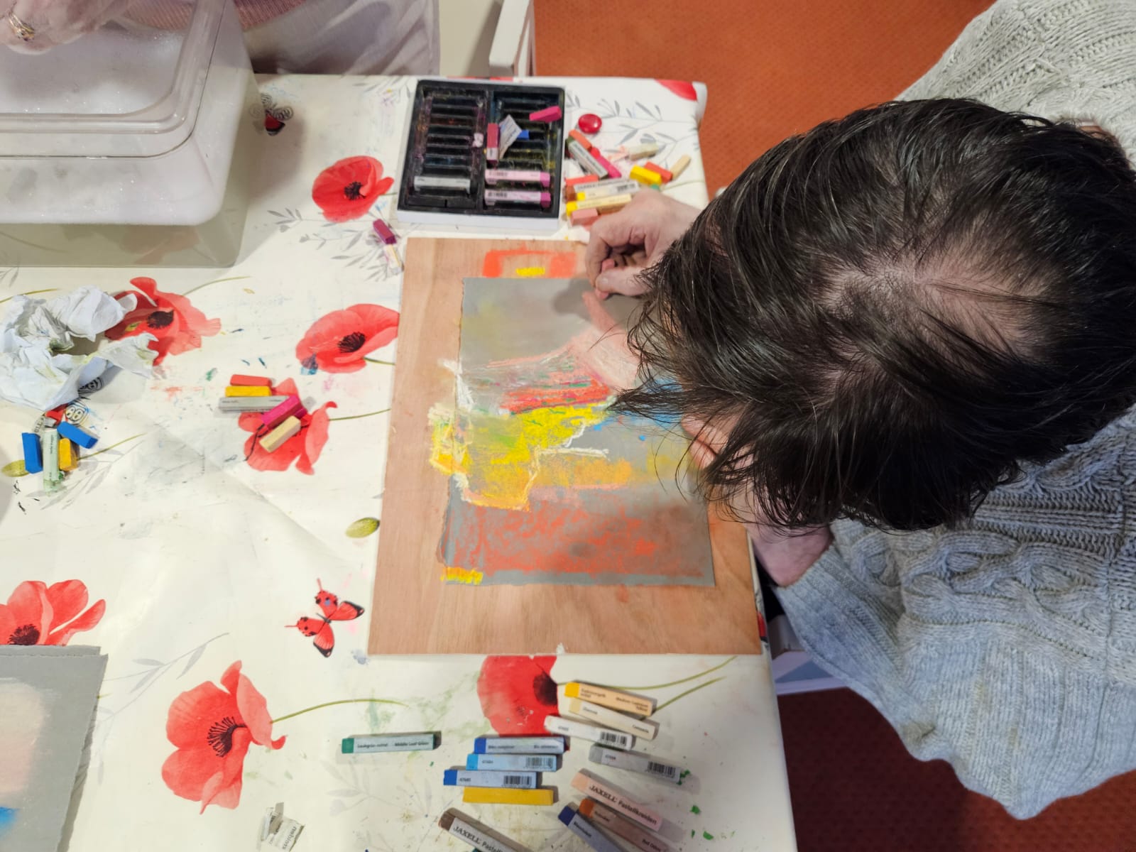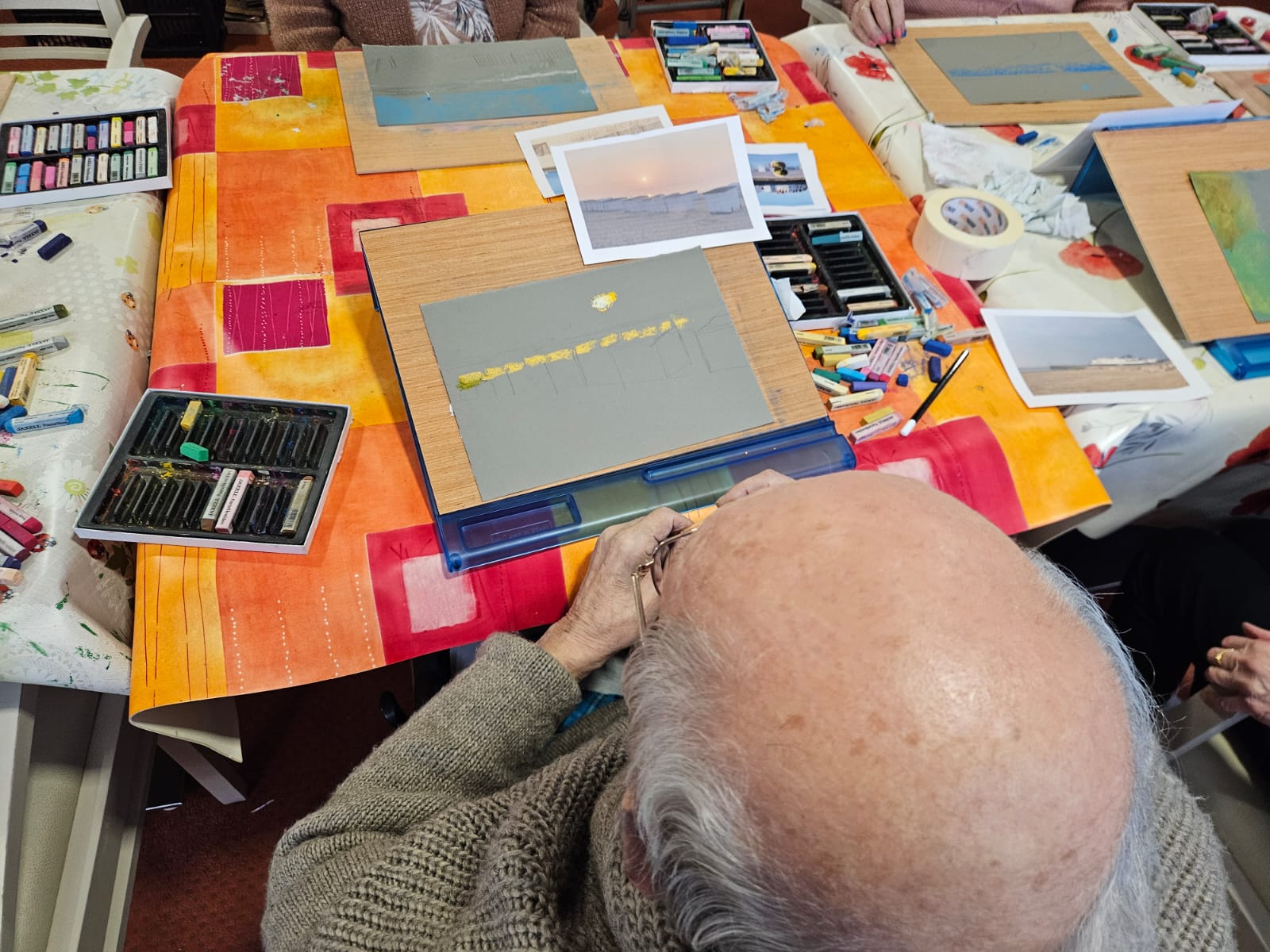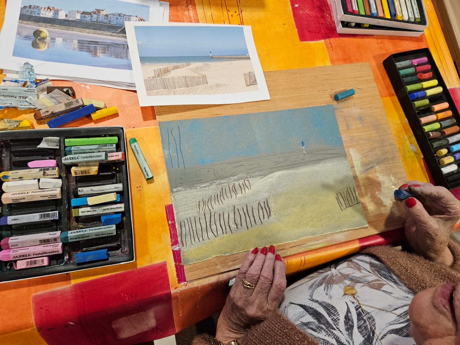 Atelier pastels secs à l'EHPAD La Lorraine à Calais, le 10 décembre 2025.