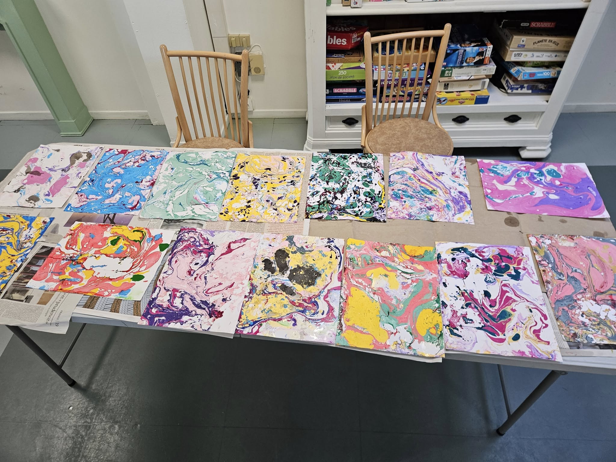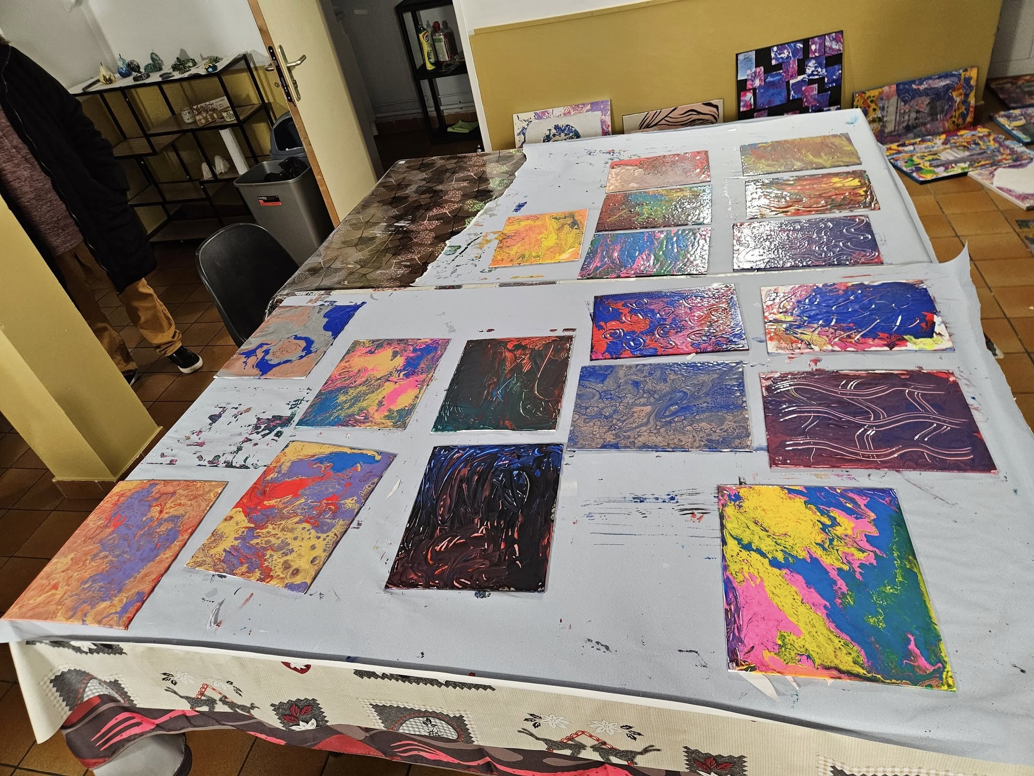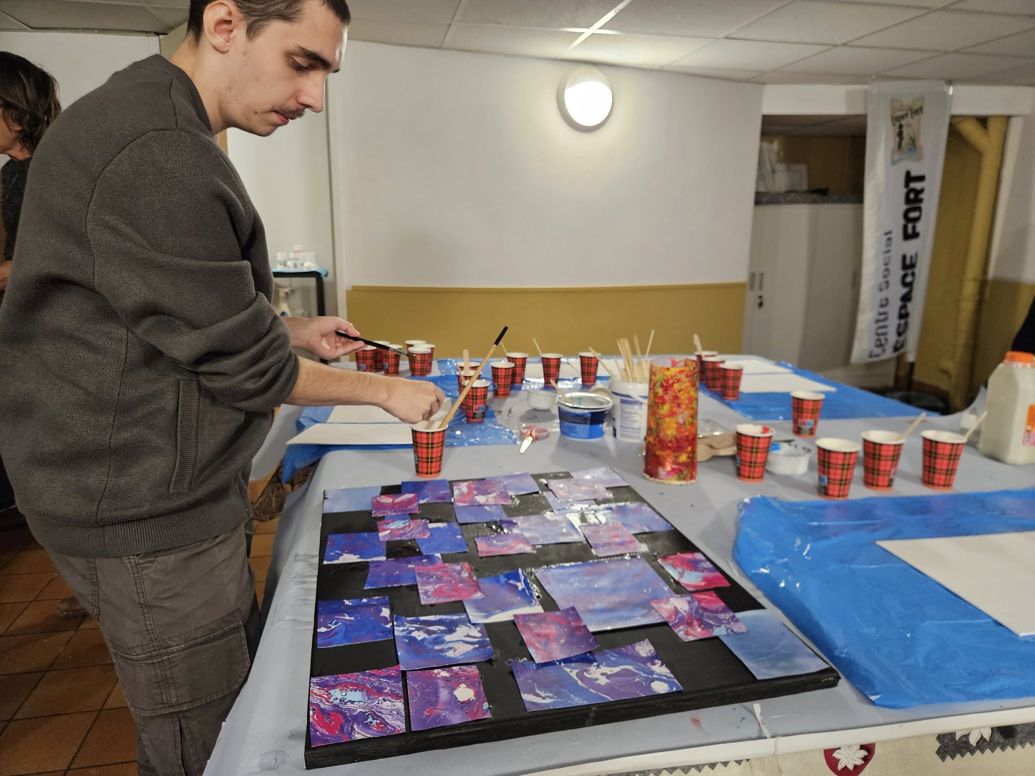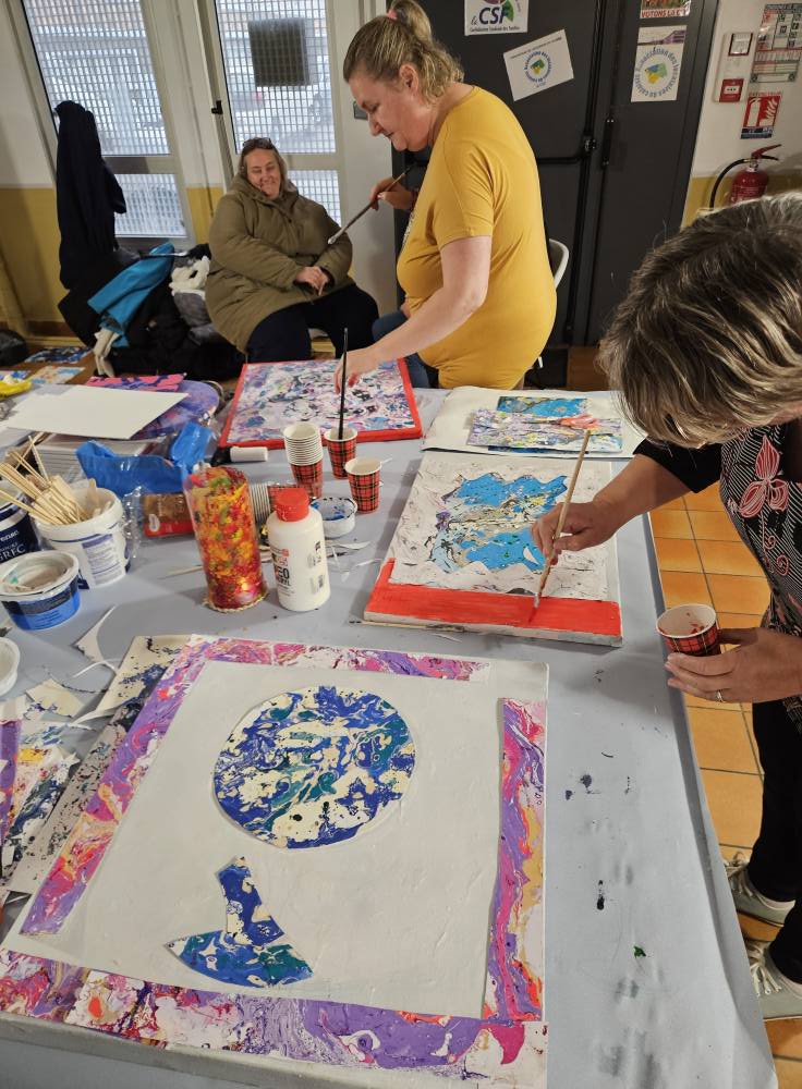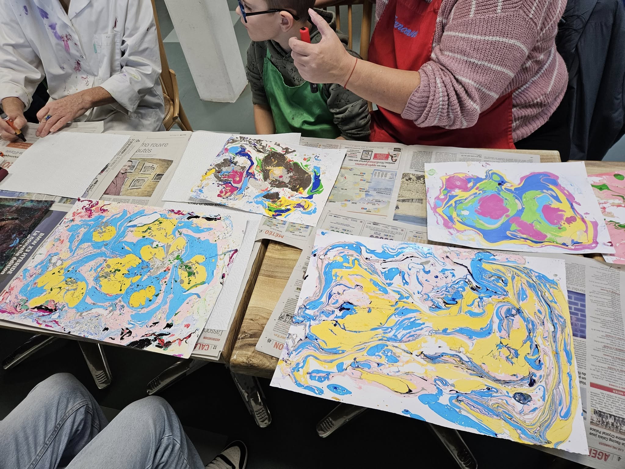 Peinture marbrée et pouring à l'Espace Fort, à Calais, groupe adulte, le 3 décembre 2025.