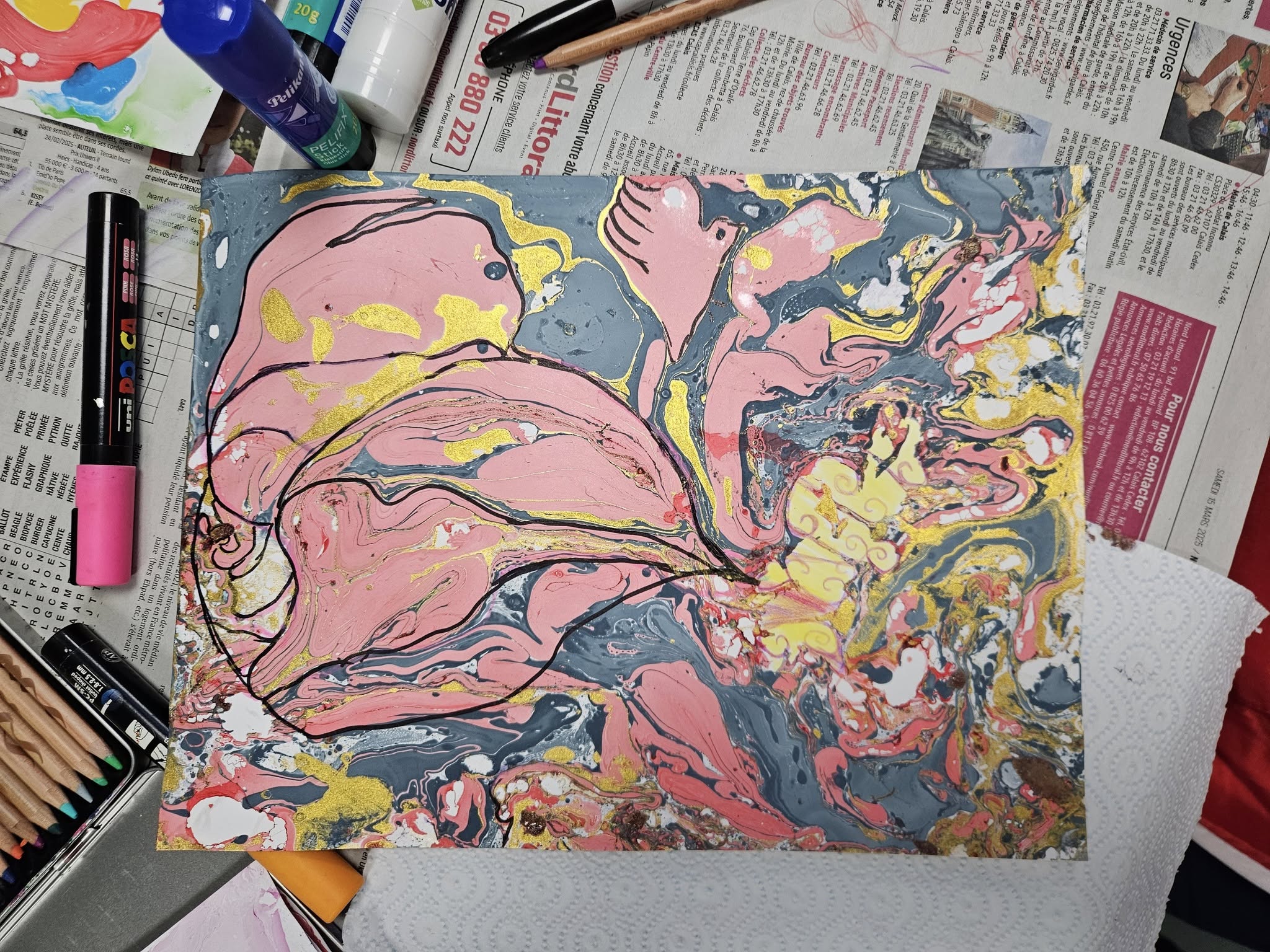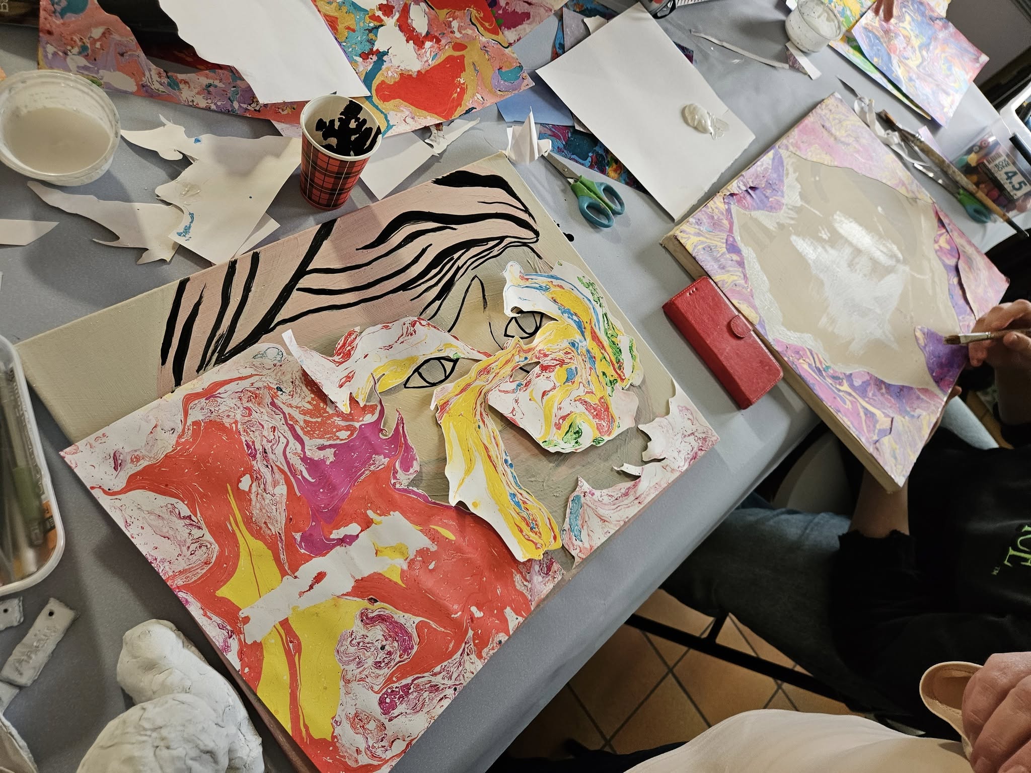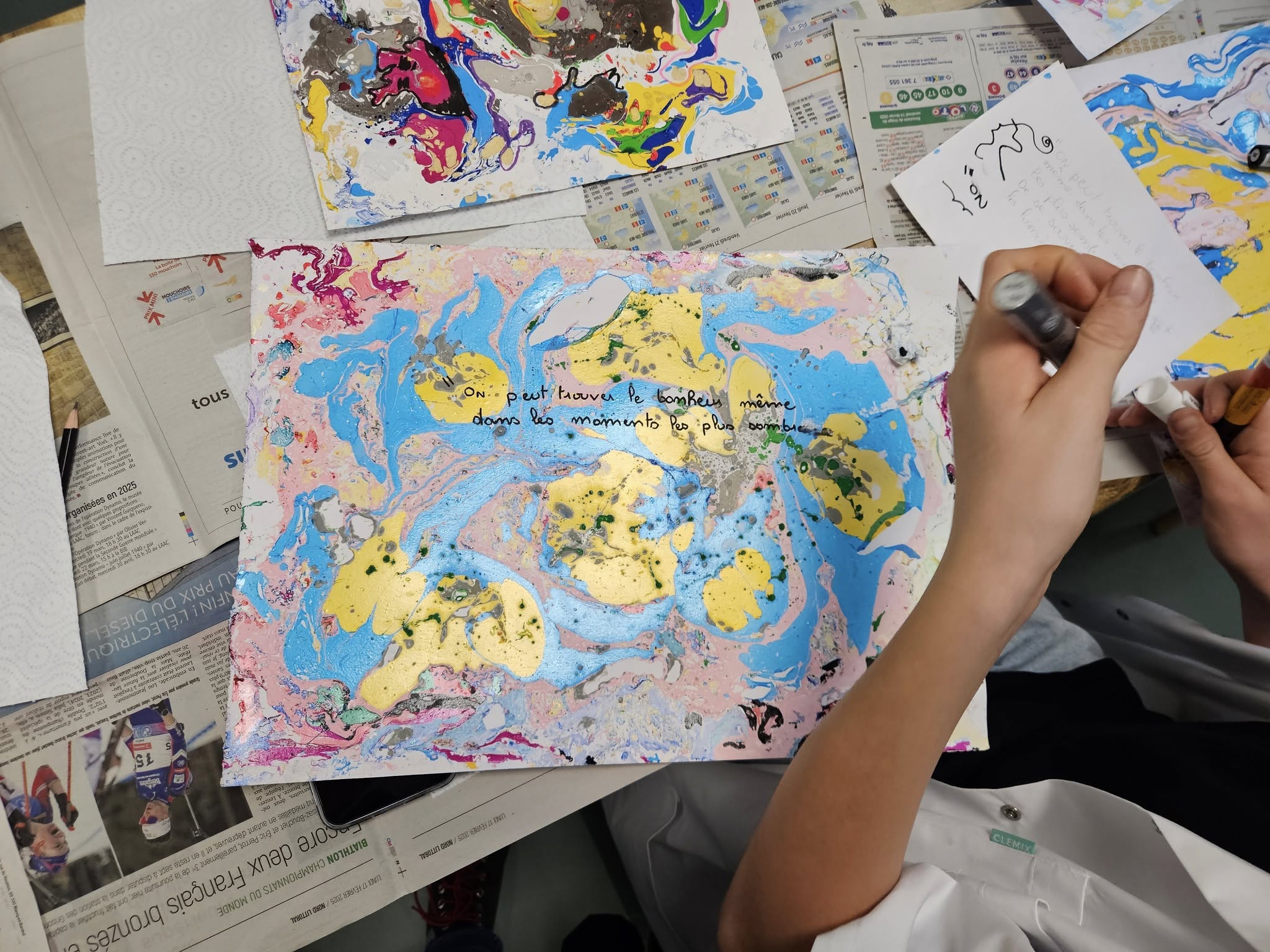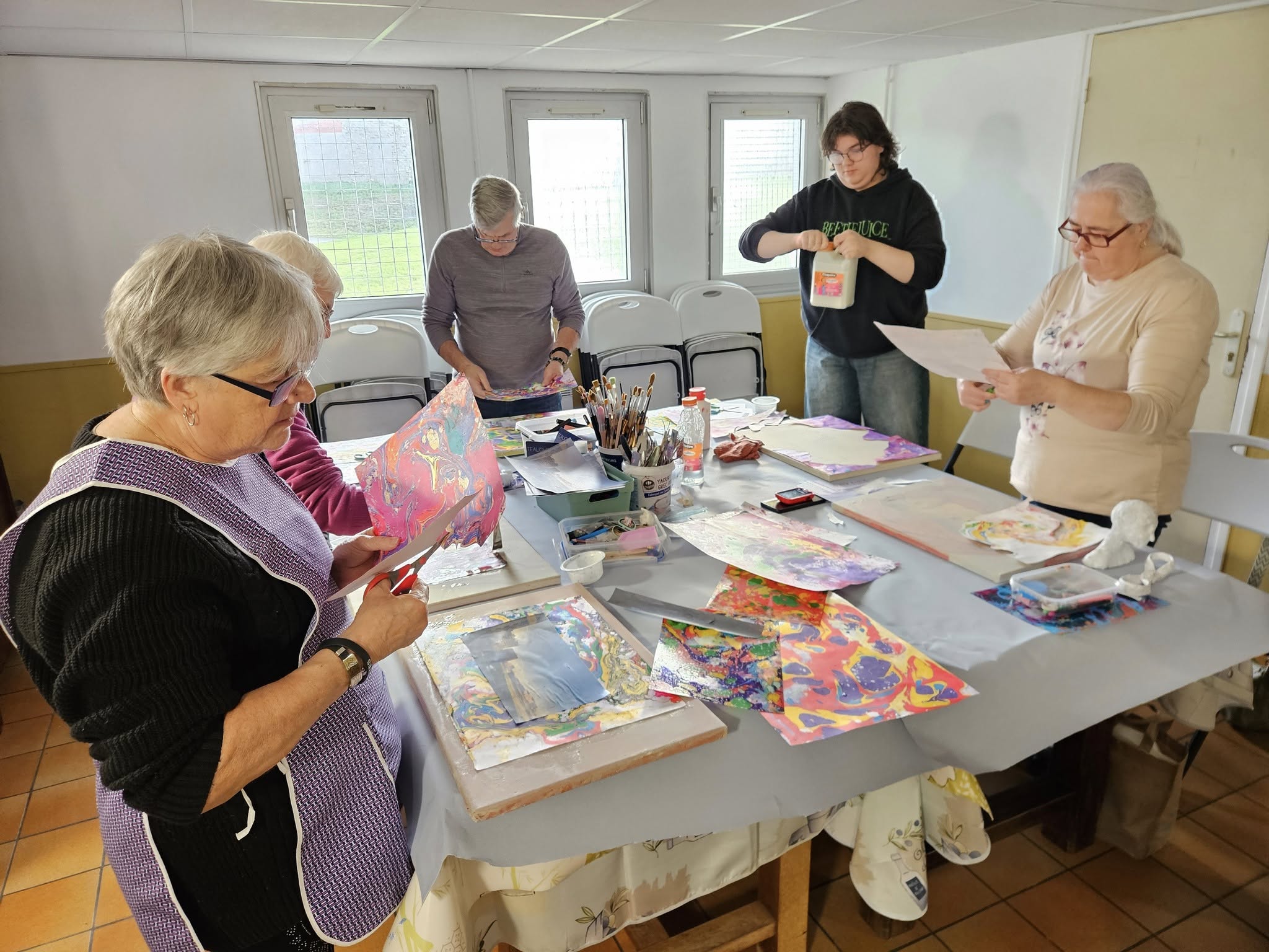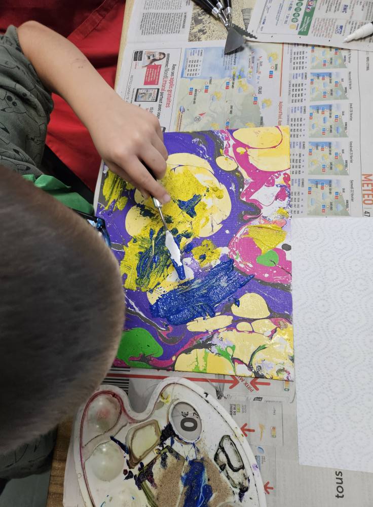 Peinture marbrée et pouring à l'Espace Fort, à Calais, groupe adulte, le 3 décembre 2025.