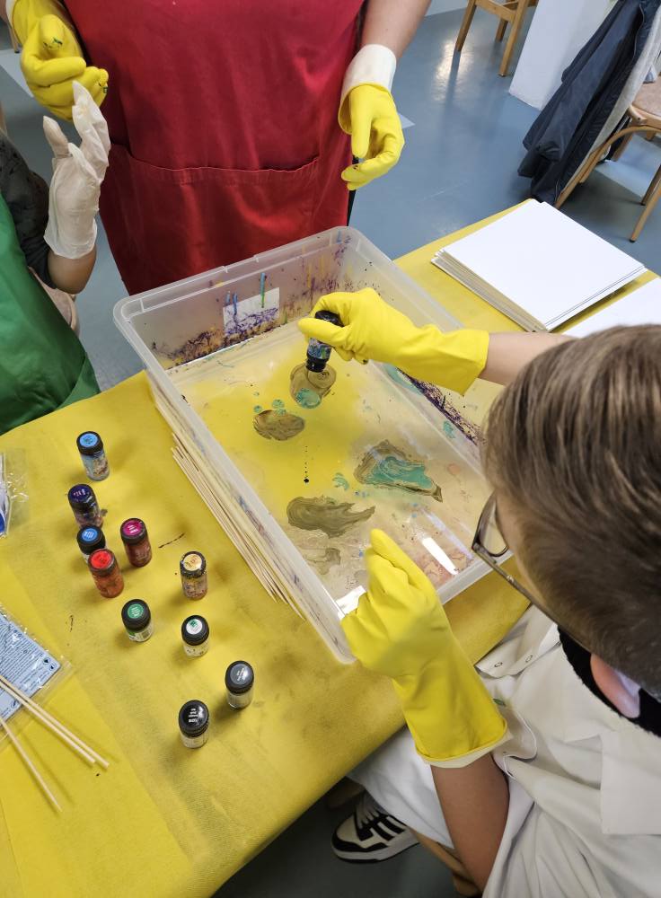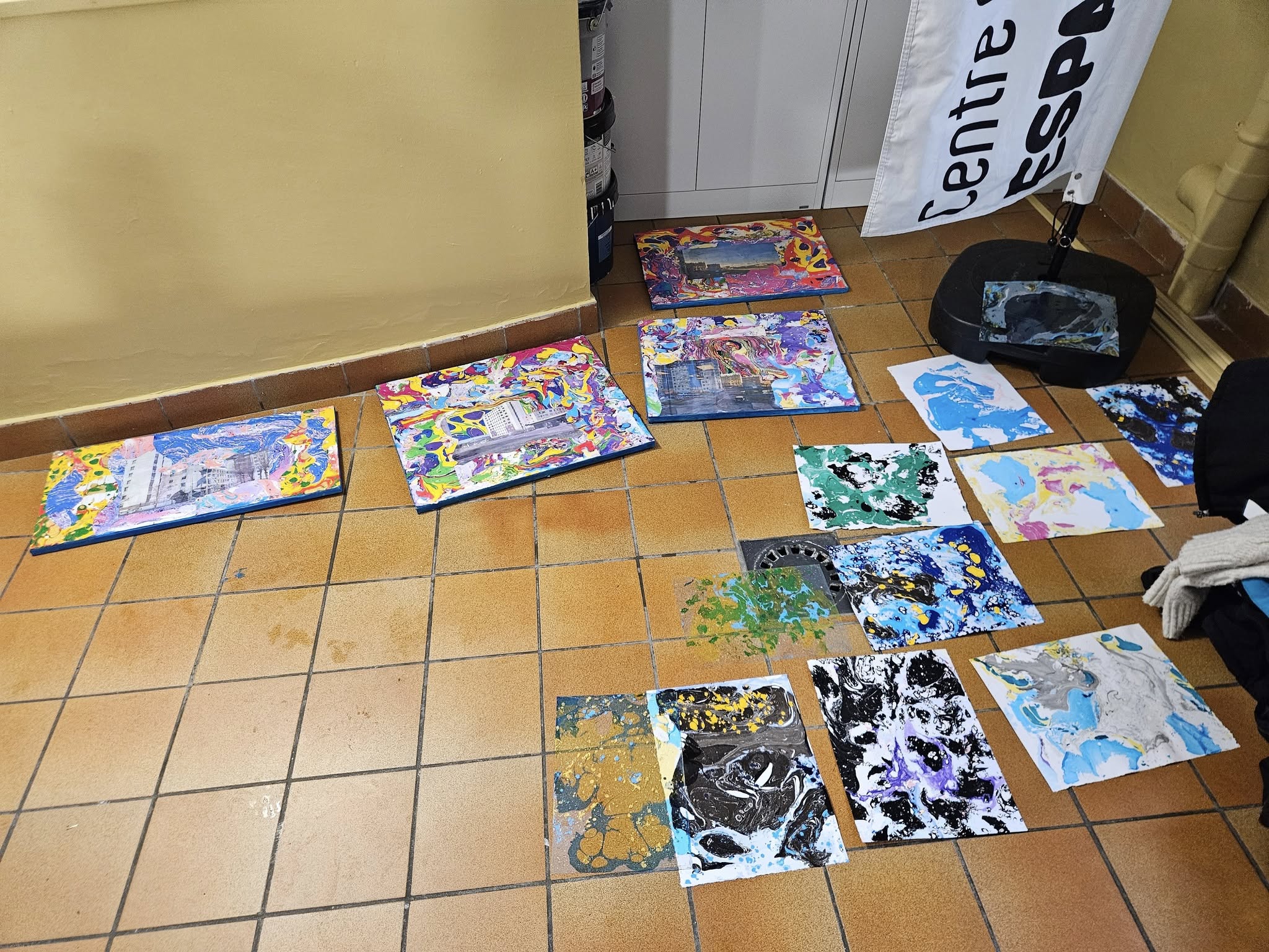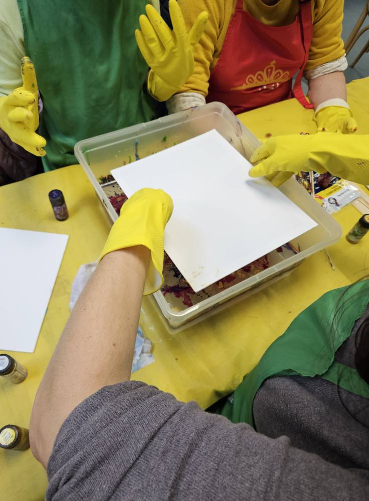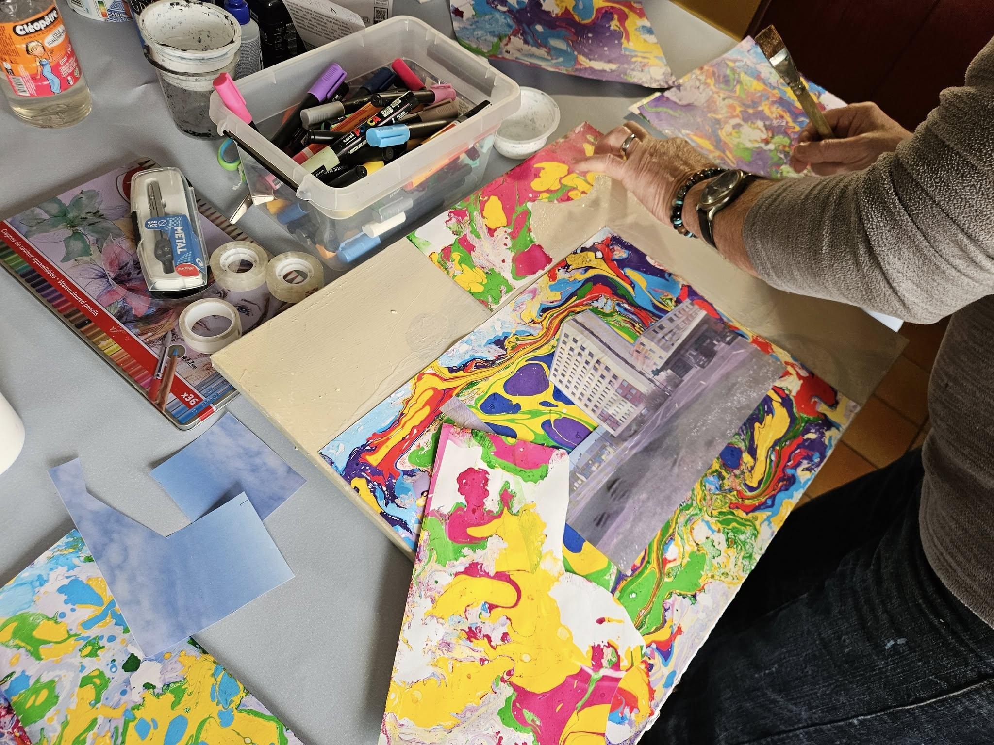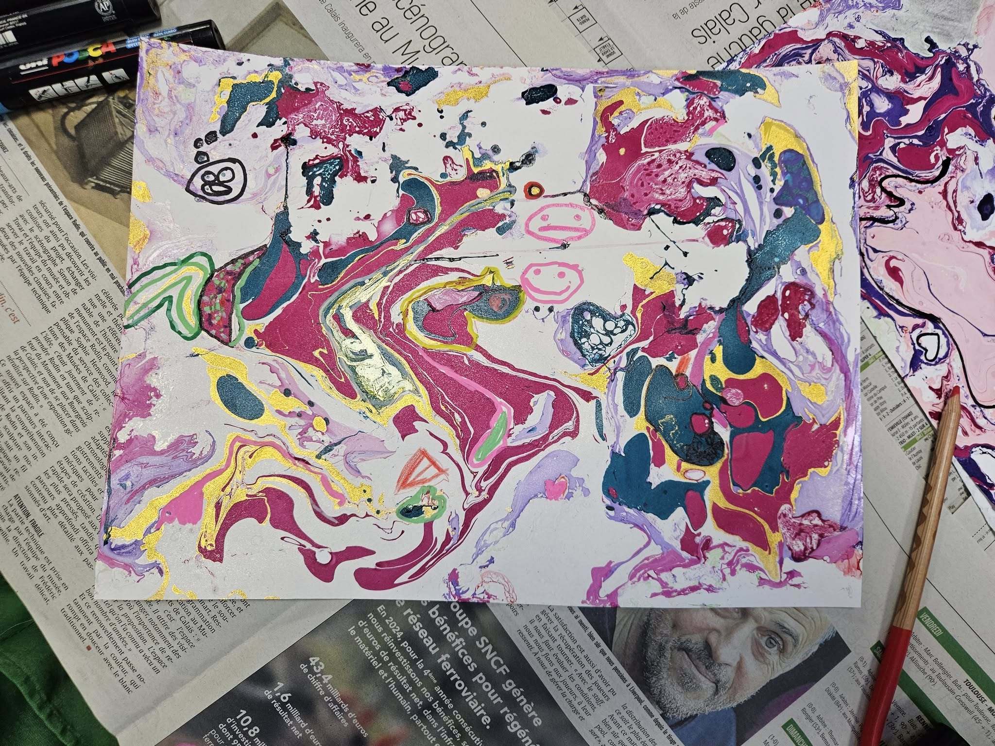 Peinture marbrée et pouring à l'Espace Fort, à Calais, groupe adulte, le 3 décembre 2025.