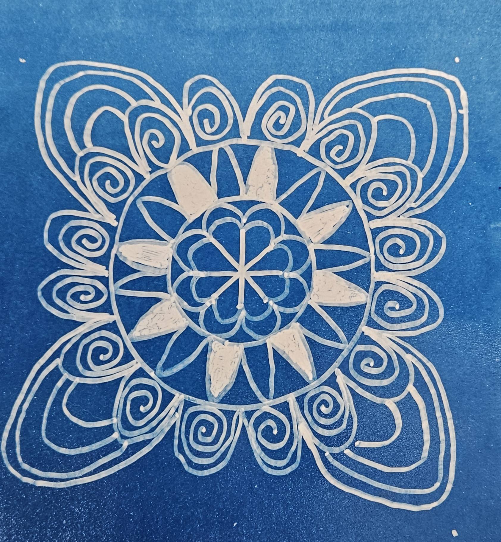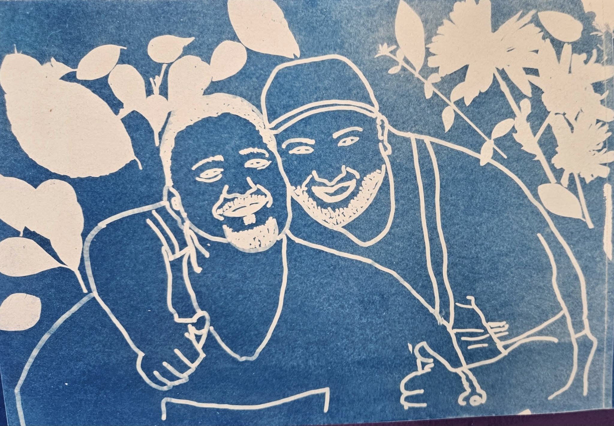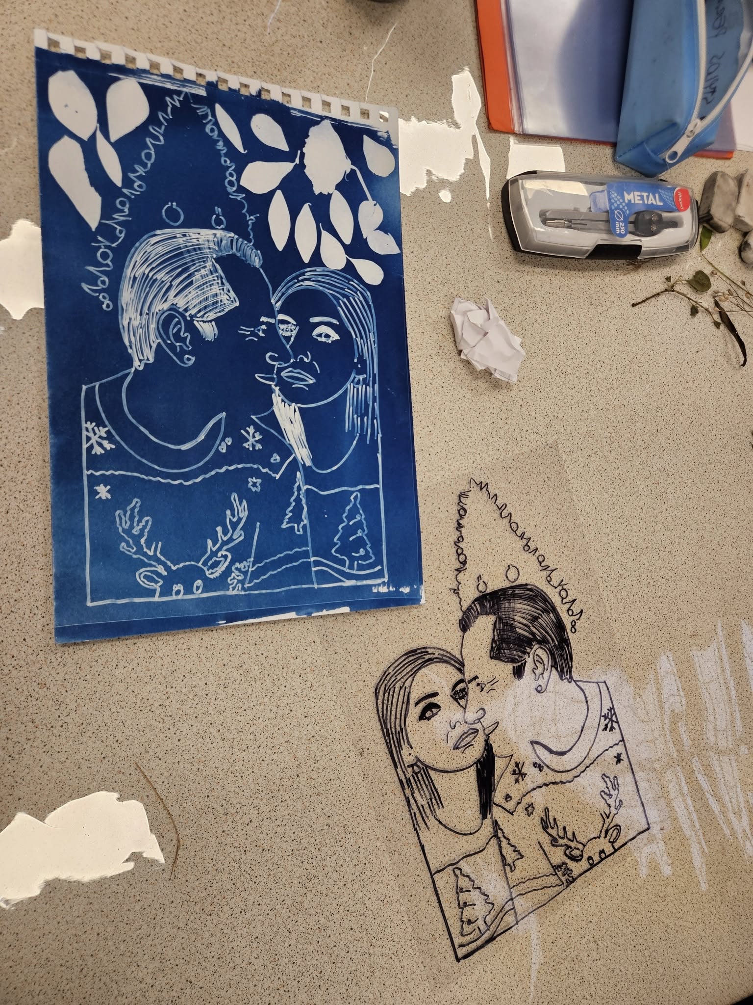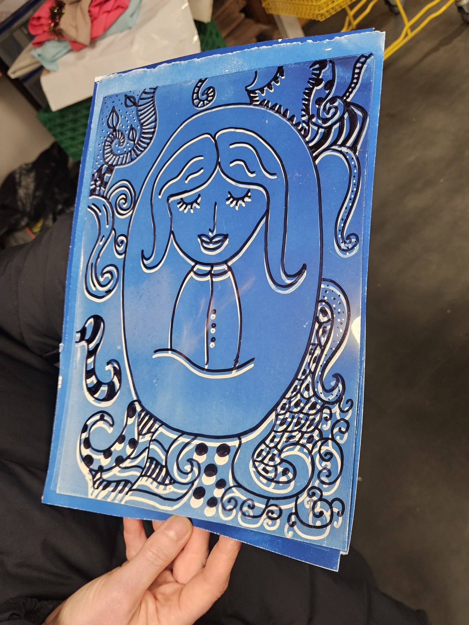 Février 2025 :Atelier parent-enfants à domicile dans le secteur de Desvres. Réalisation d'une oeuvre collective en cyanotype.
