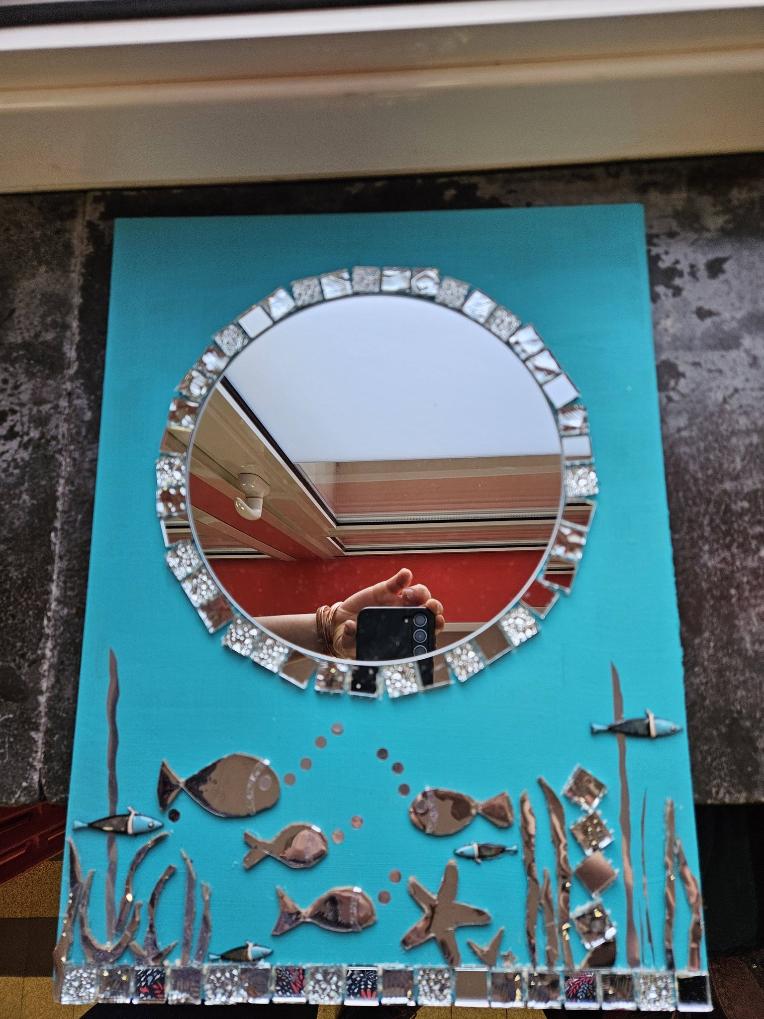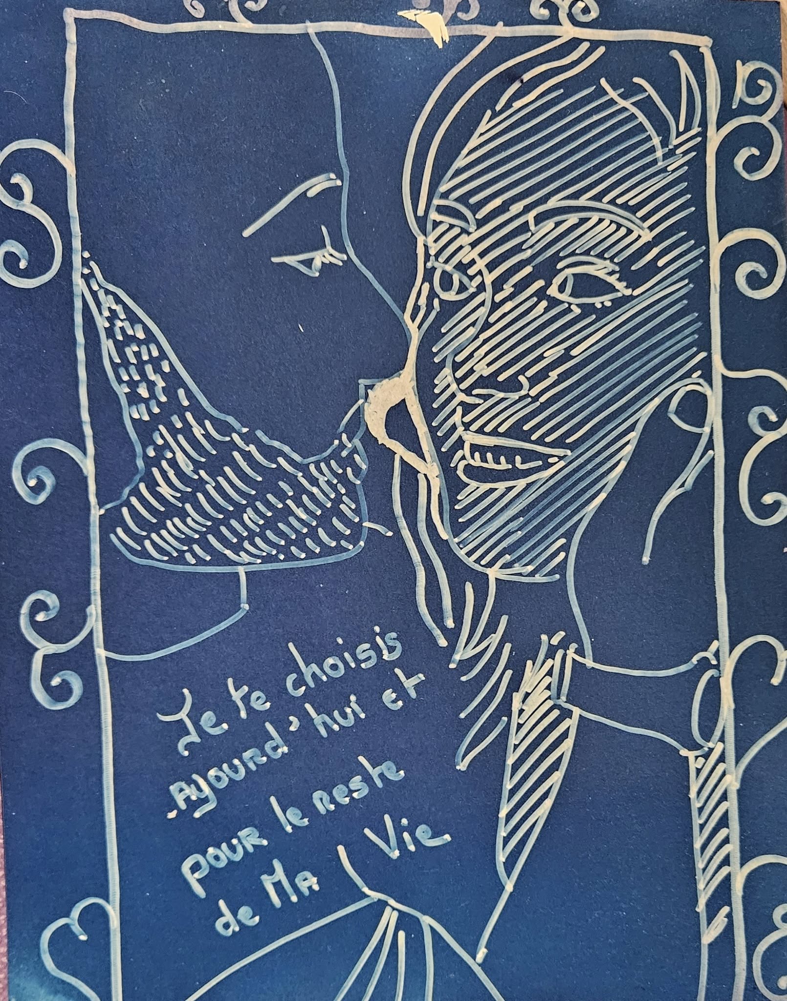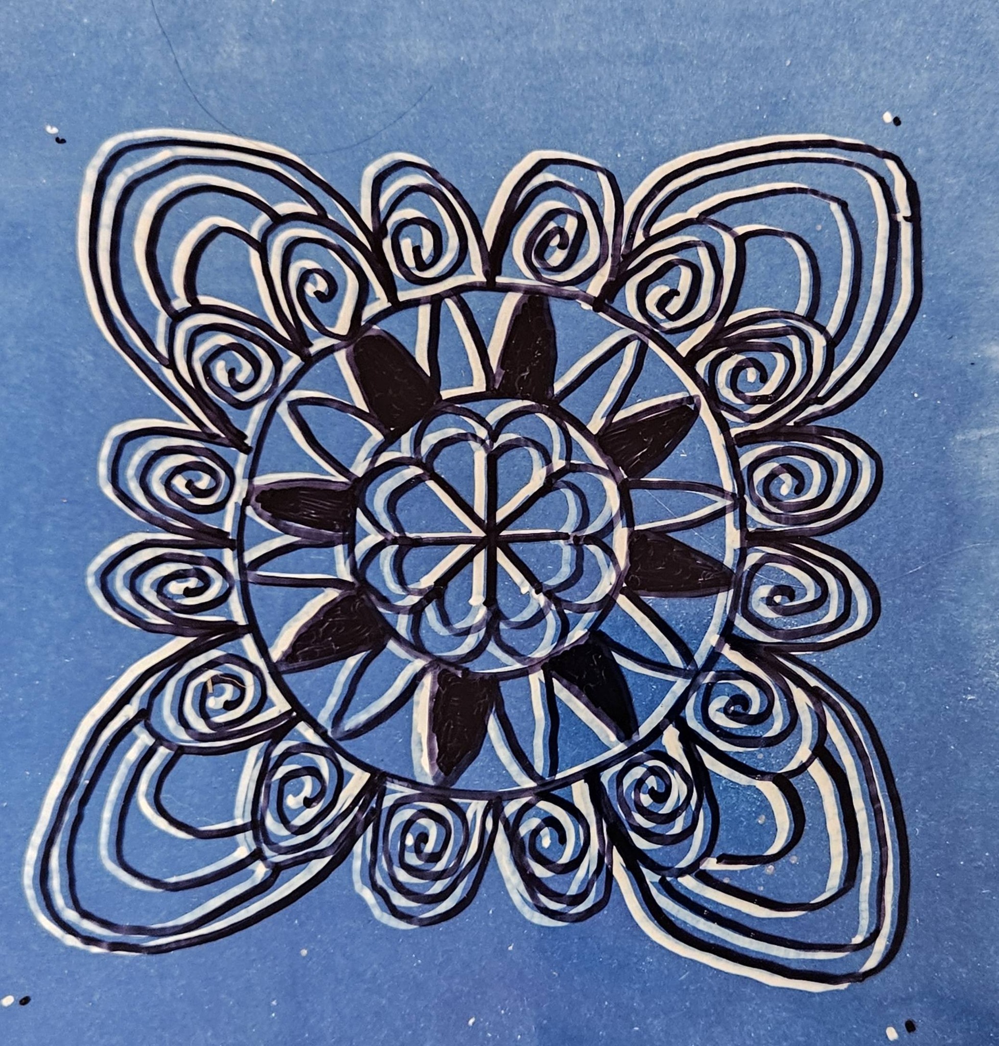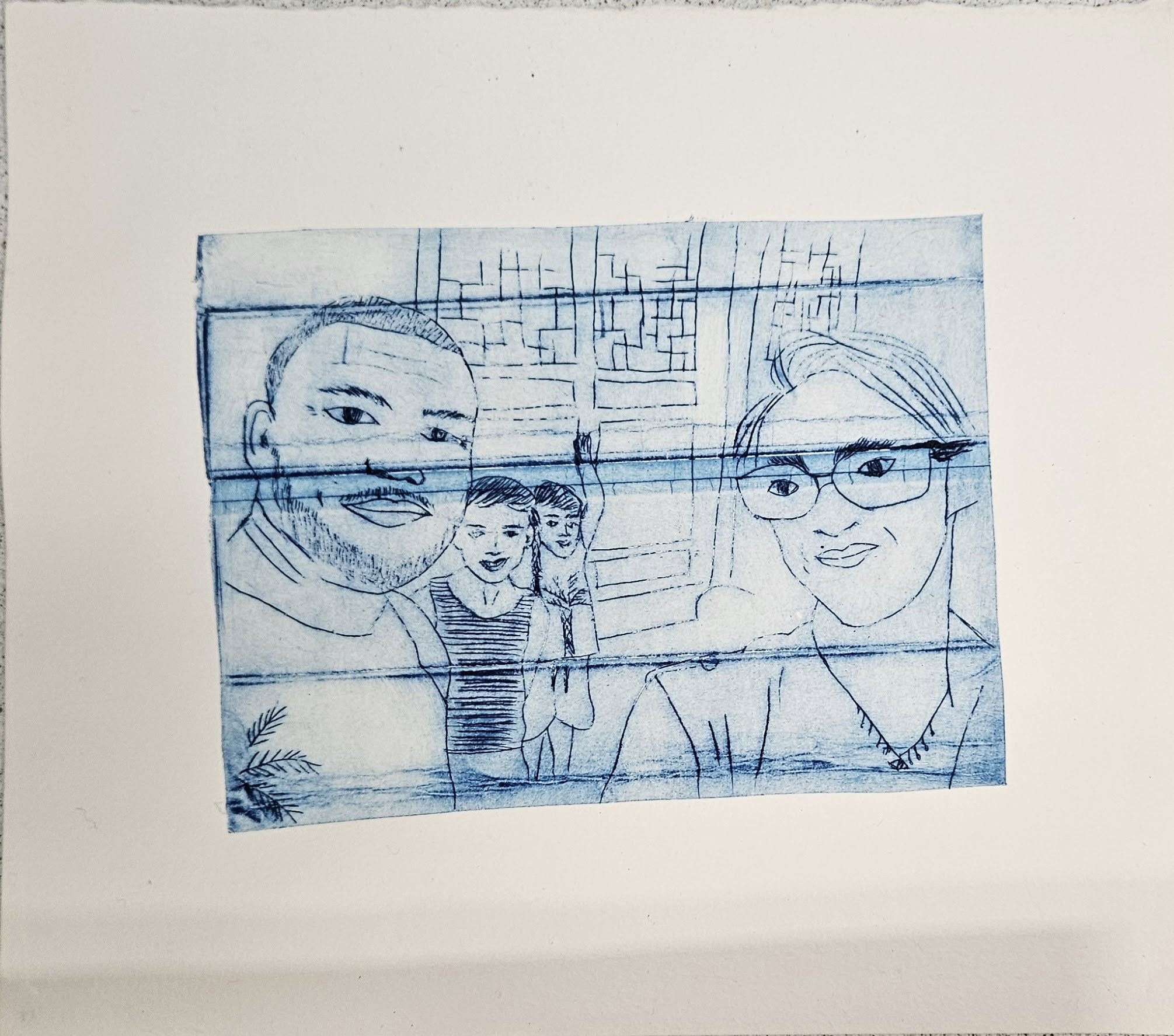 Février 2025 :Atelier parent-enfants à domicile dans le secteur de Desvres. Réalisation d'une oeuvre collective en cyanotype.