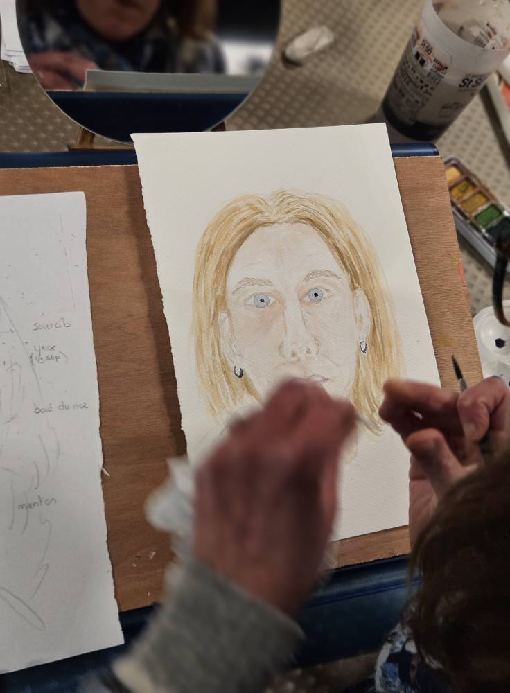 Superbe découverte du portrait et du fusain avec Julie. Grâce à la guidance très pro de Julie et sa patience, nous avons réalisé des auto-portraits et une excellente après-midi.