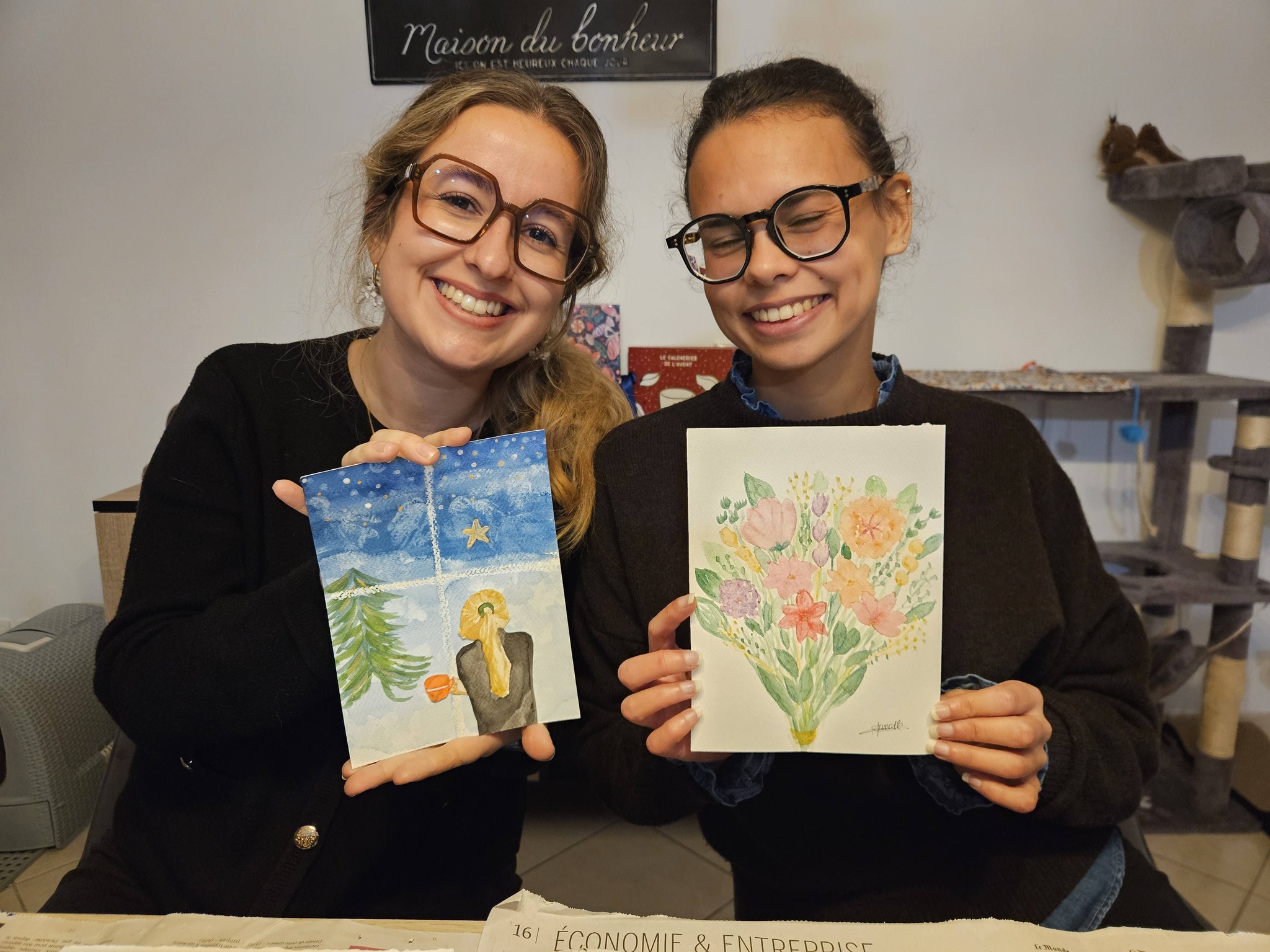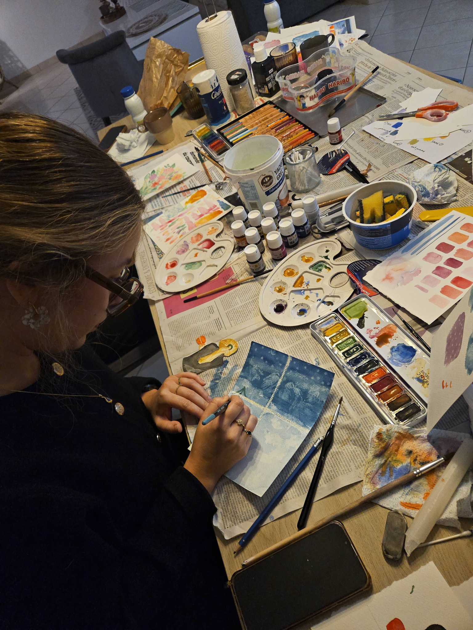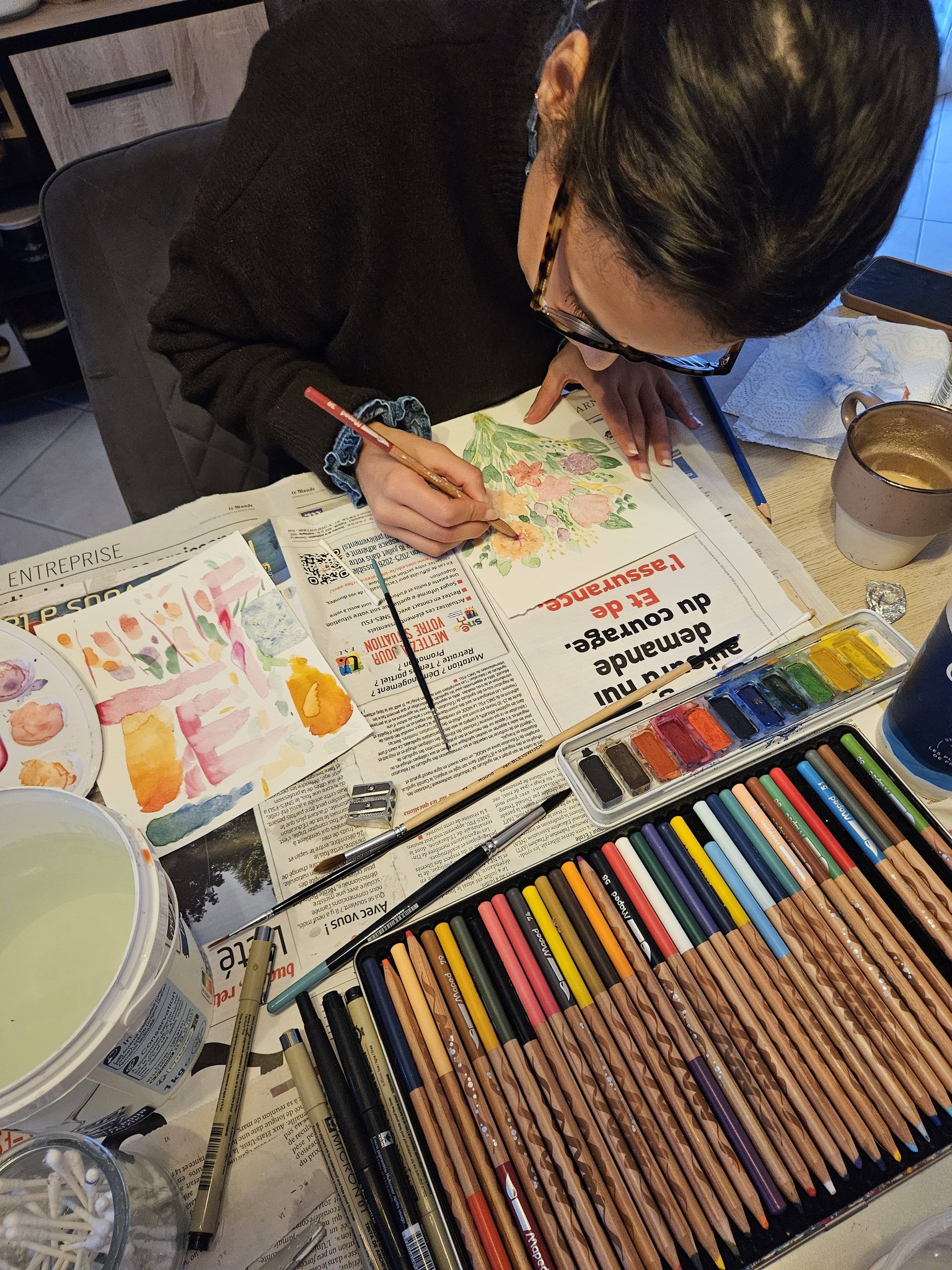 Atelier aquarelle à domicile cet après-midi. J’accompagne dans la réalisation du projet, montre des techniques et astuces et aide à aller au bout du projet. Un chouette moment !