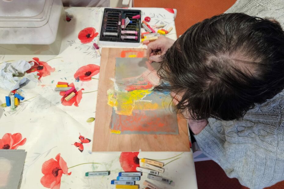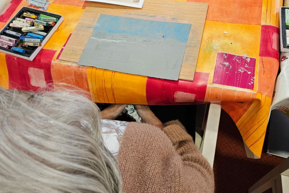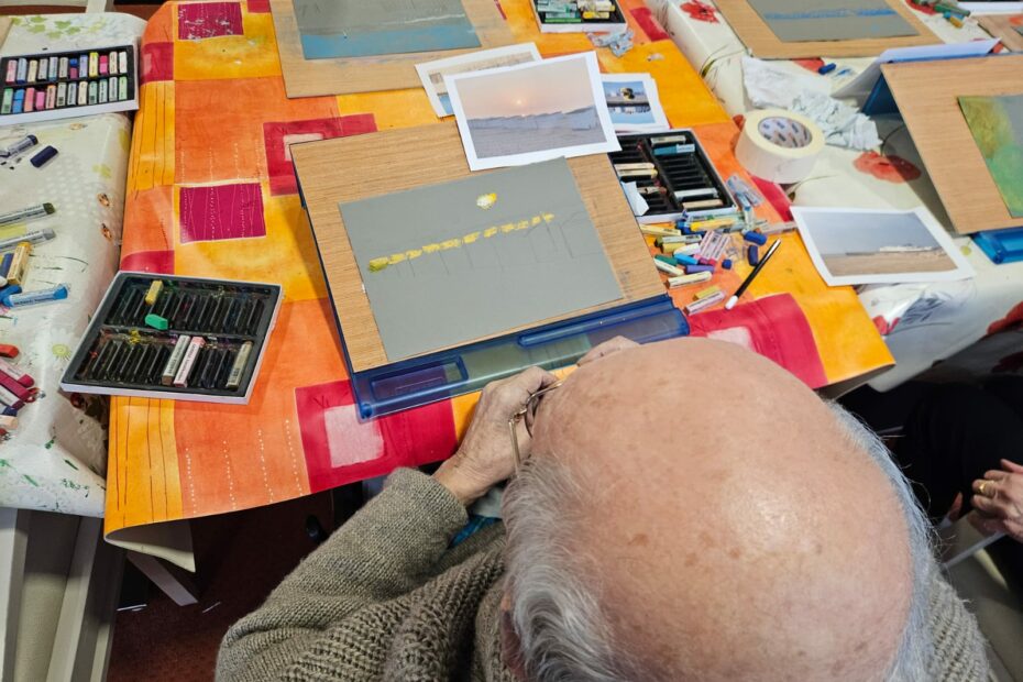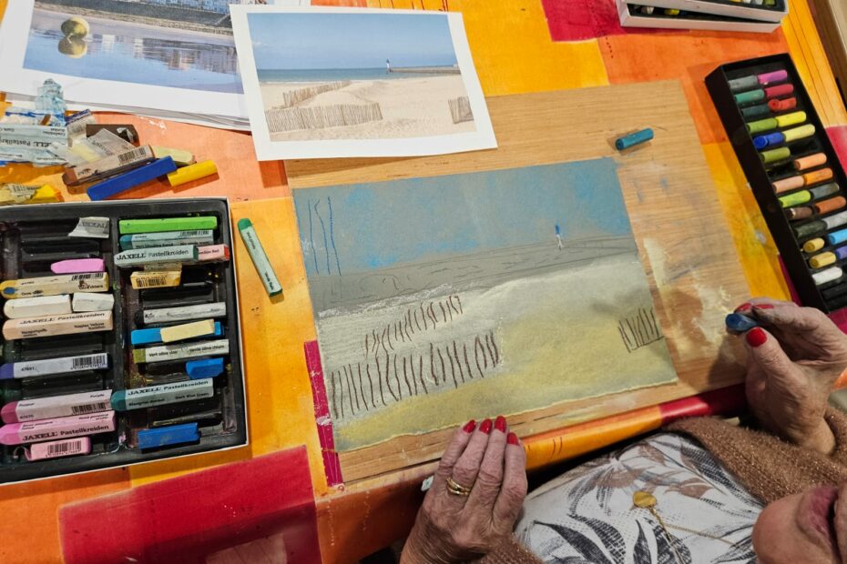 Atelier pastels secs à l'EHPAD La Lorraine à Calais, le 10 décembre 2025.