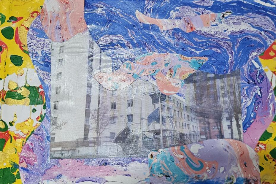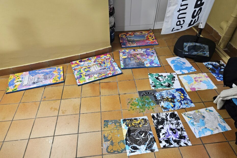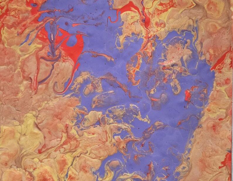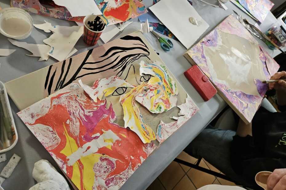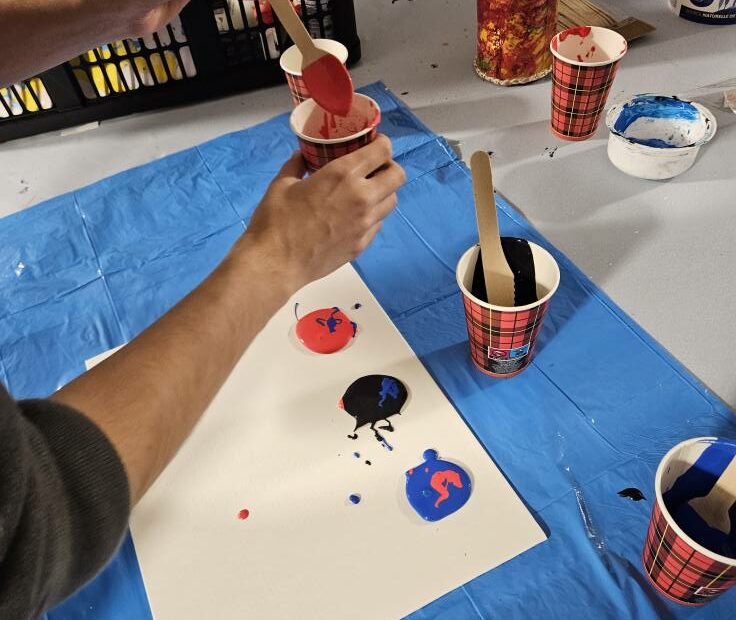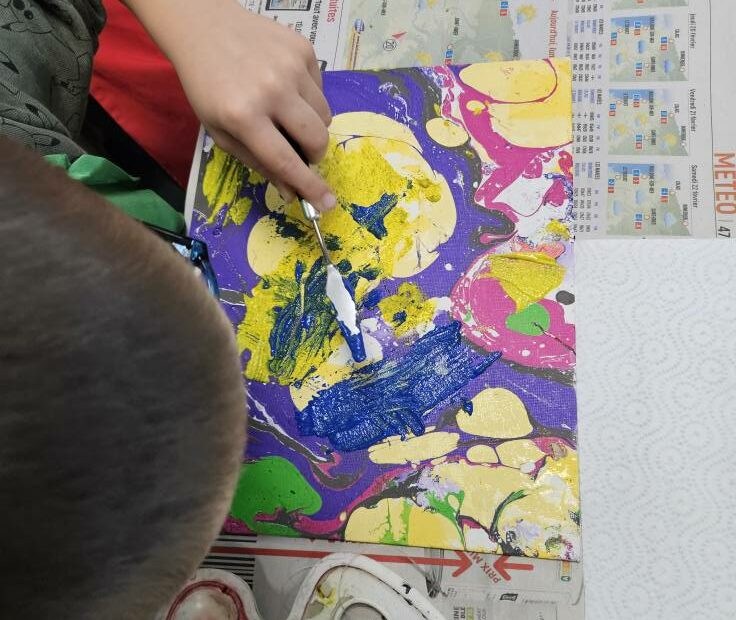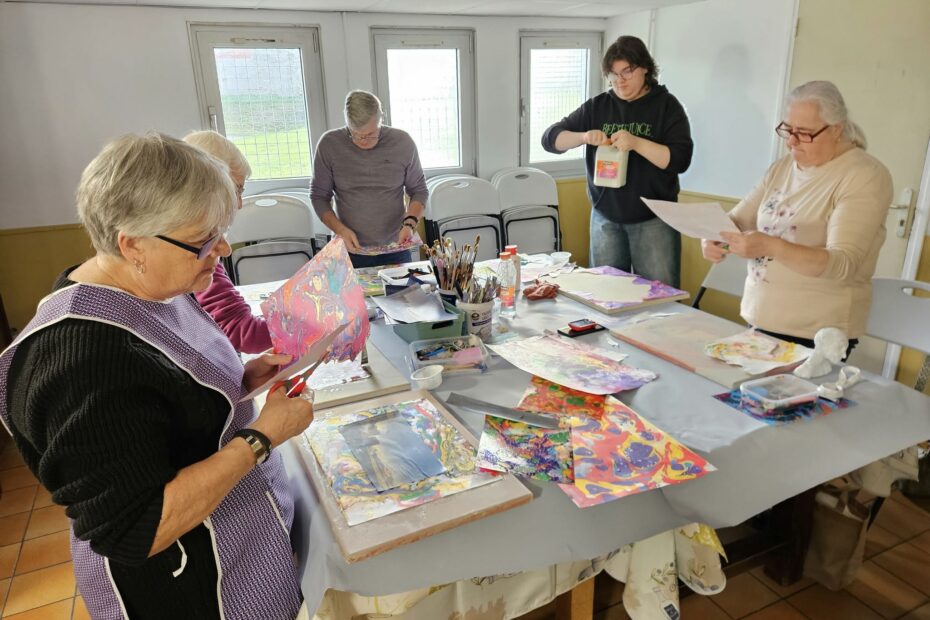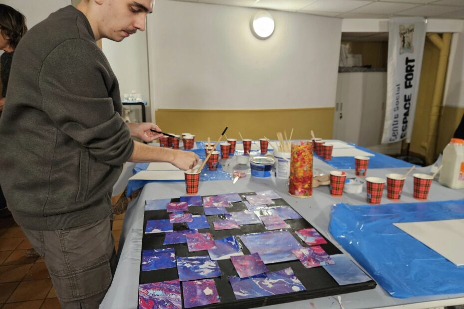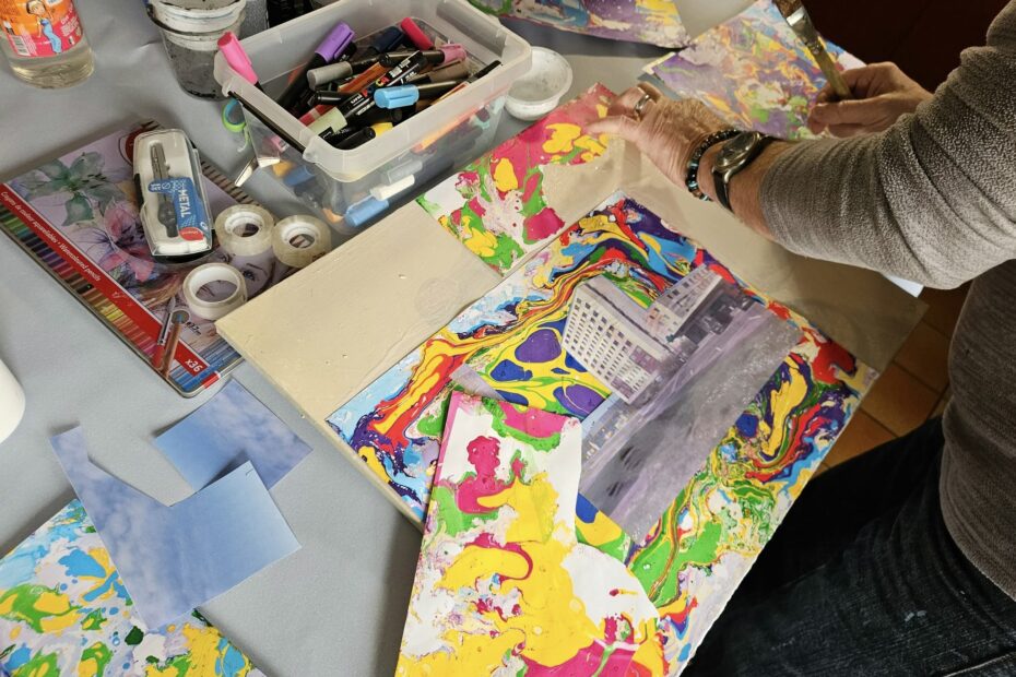 Peinture marbrée et pouring à l'Espace Fort, à Calais, groupe adulte, le 3 décembre 2025.