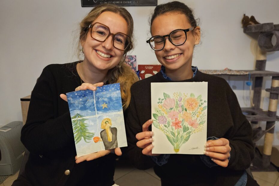 Atelier aquarelle à domicile cet après-midi. J’accompagne dans la réalisation du projet, montre des techniques et astuces et aide à aller au bout du projet. Un chouette moment !